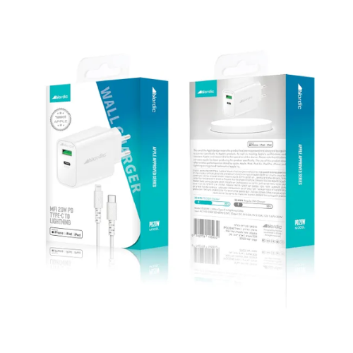 מטען קיר NORDIC GaN PD 20W עם כבל לייטנינג מאושר אפל MFI