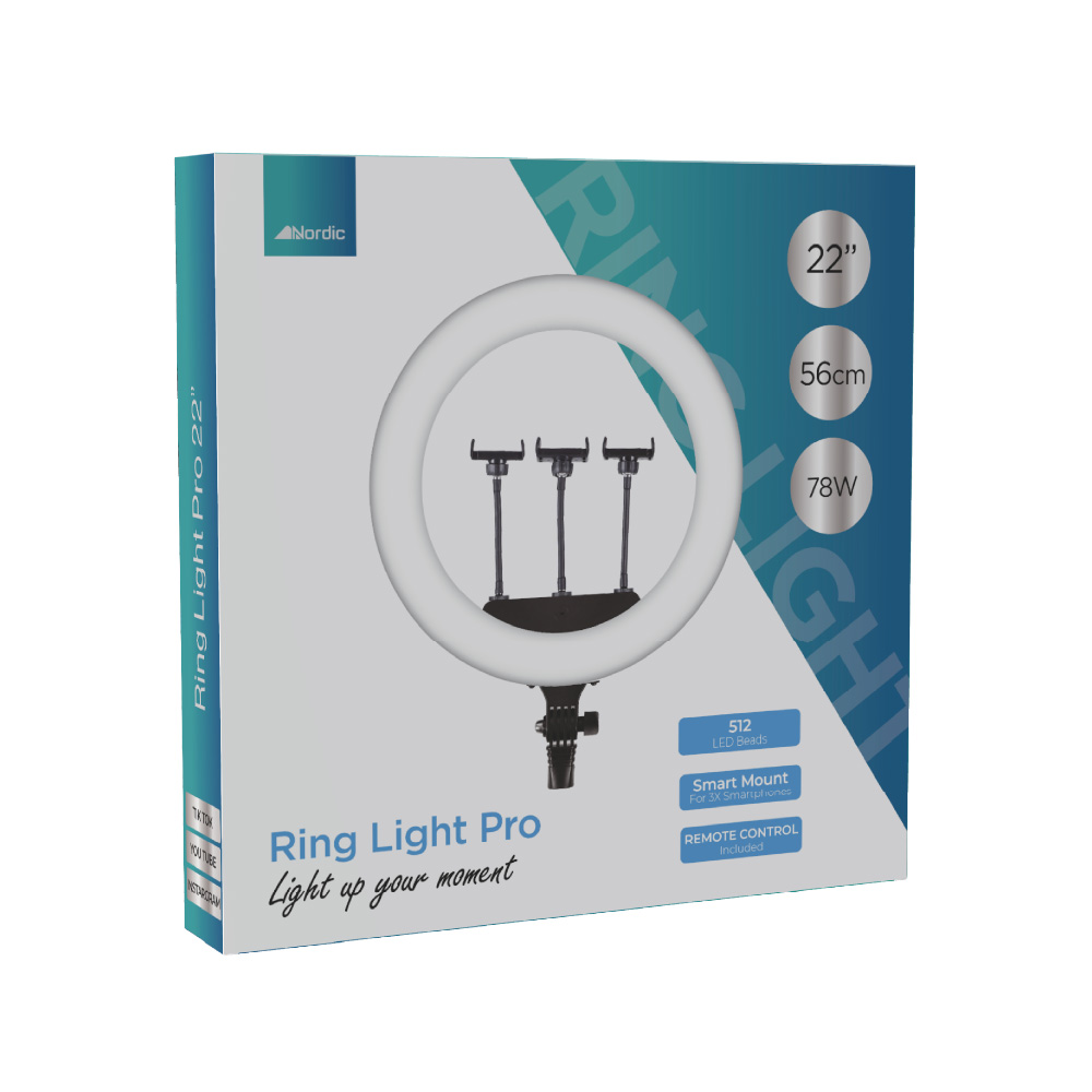 הביאו את רמת התאורה שלכם לשלב הבא עם NORDIC LIGHT PRO – רינג לייט בקוטר 56 ס”מ עם עוצמה של 78W ו-512 נורות LED שמספקות תאורה אחידה, רכה ומקצועית בכל סביבה.